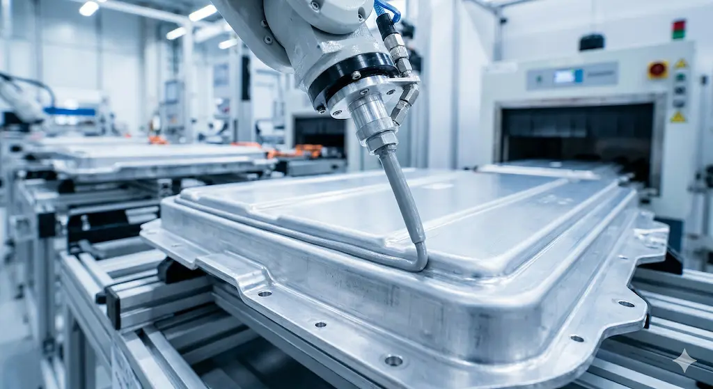 El sector que más rápidamente ha transformado su estrategia de unión es el de los vehículos eléctricos de automoción. En la próxima generación de vehículos eléctricos de batería (BEV), los módulos de batería requieren el encapsulado de las células mediante adhesivos térmicamente conductores (Thermal Interface Materials, TIM) con conductividades de entre 1 y 6 W/m-K, combinados con adhesivos estructurales para la fijación mecánica del pack a la carcasa. La cuestión crítica es doble: garantizar la transmisión térmica necesaria para mantener las células en el rango óptimo de funcionamiento (generalmente 20-40°C) y absorber las deformaciones cíclicas generadas por la expansión de las propias células. La adhesión a superficies de aluminio anodizado o imprimadas requiere un control estricto de la preparación de la superficie, sobre la que volveremos.